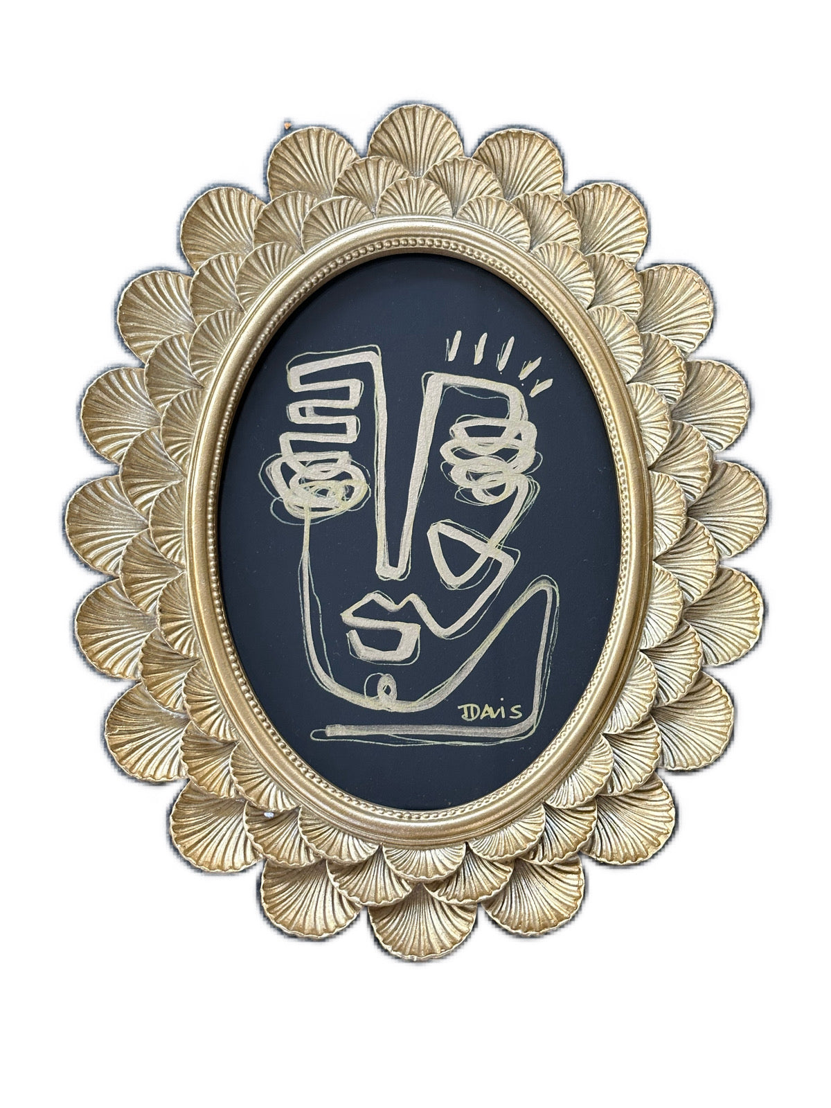gold ink on black paper, in gold frame