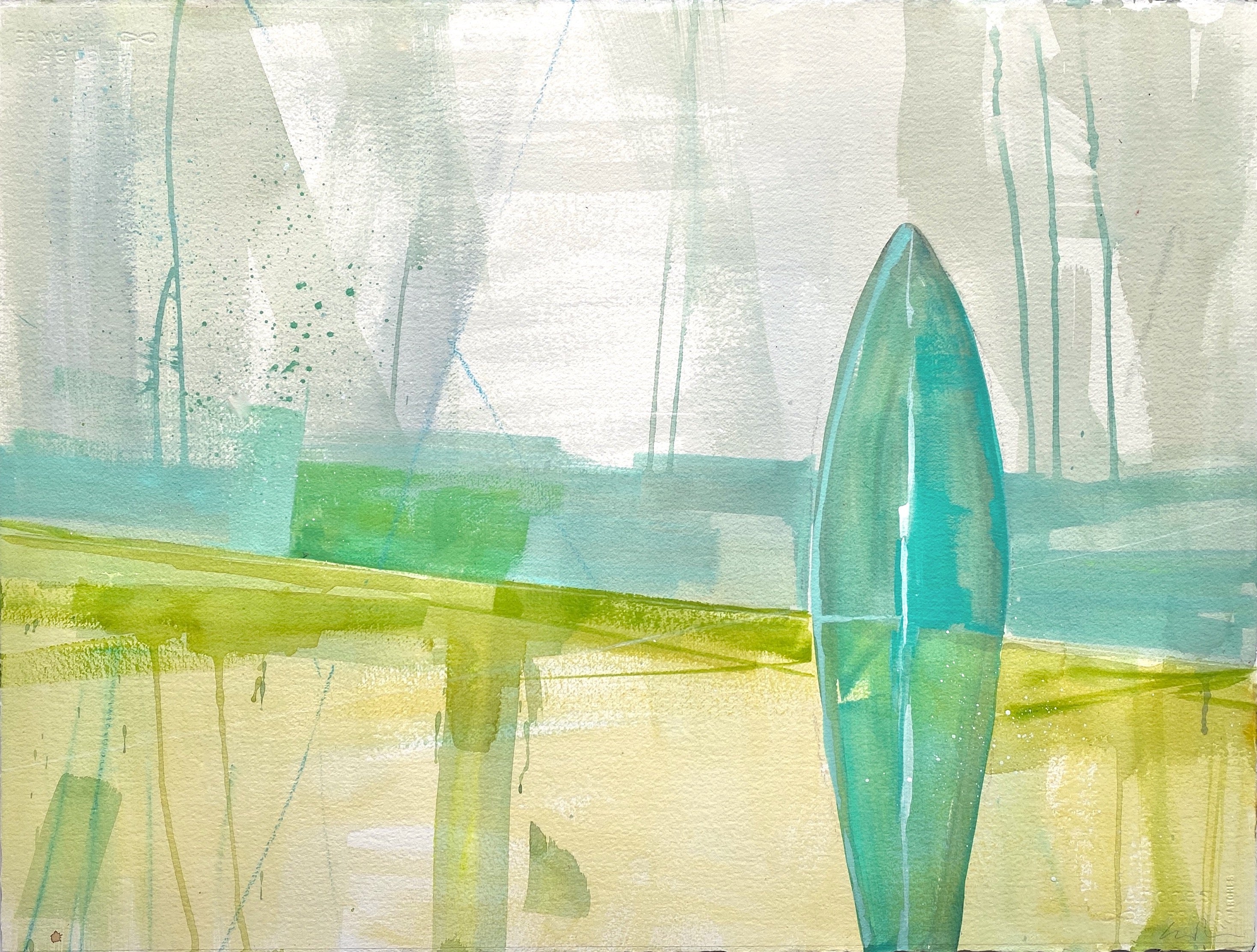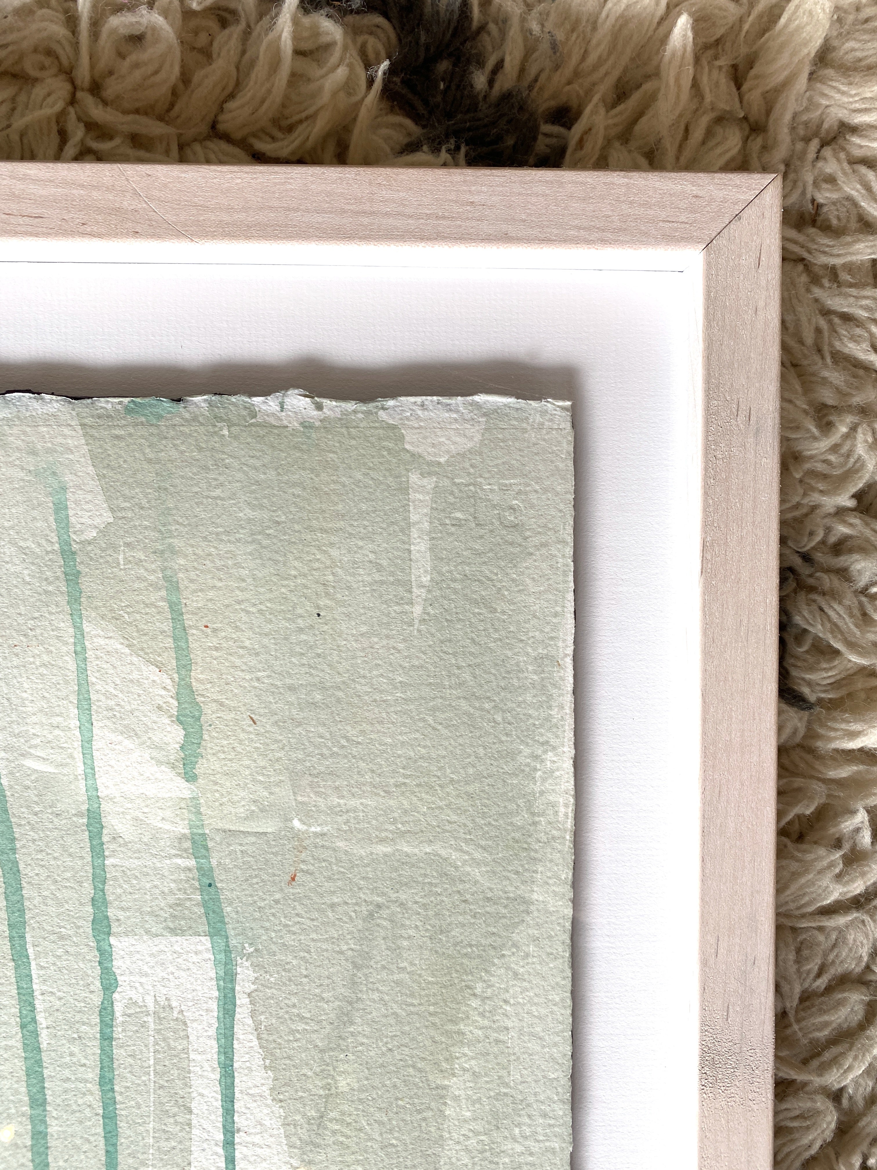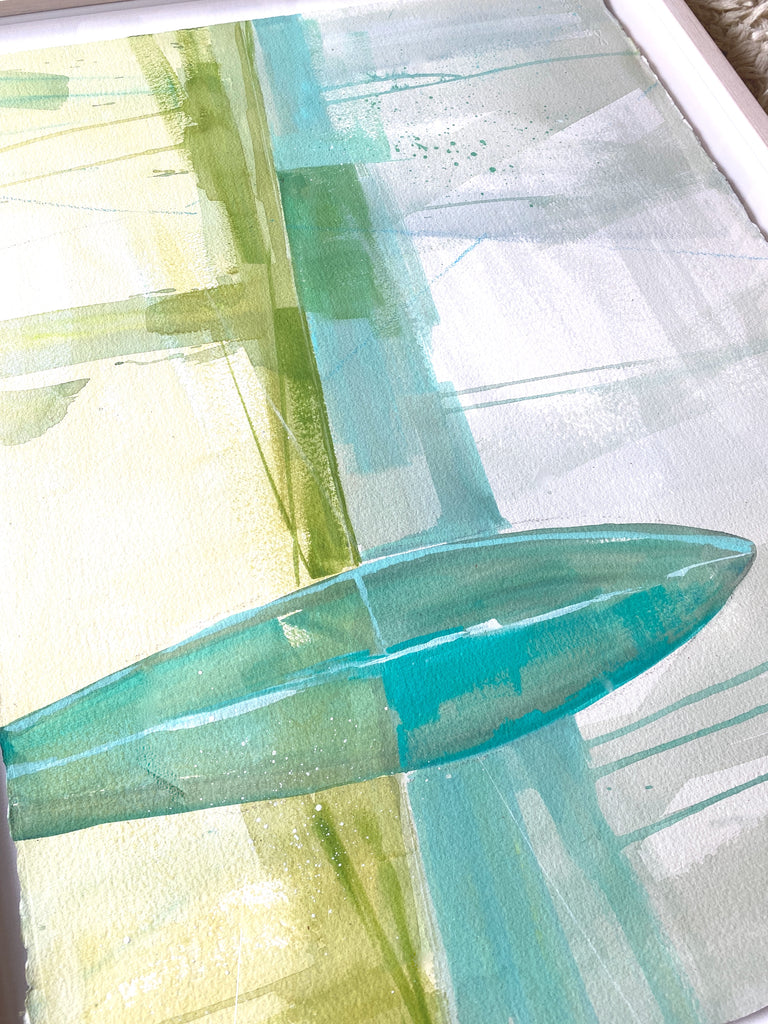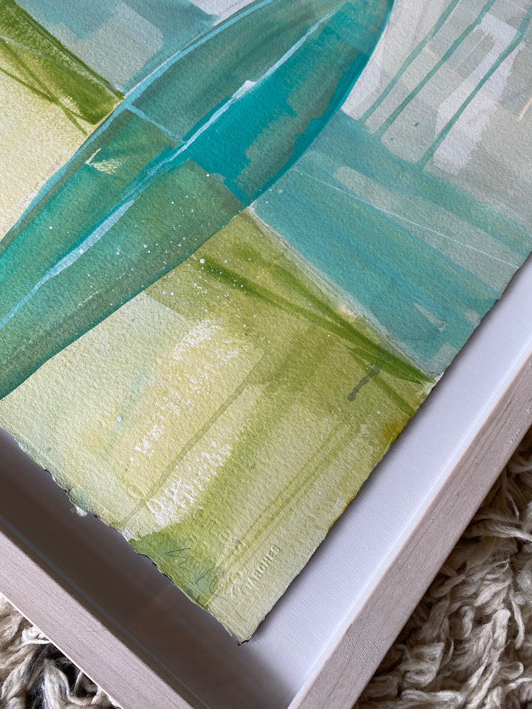 acrylic and gouache on watercolor paper, floating on white mat, in whitewashed wood frame