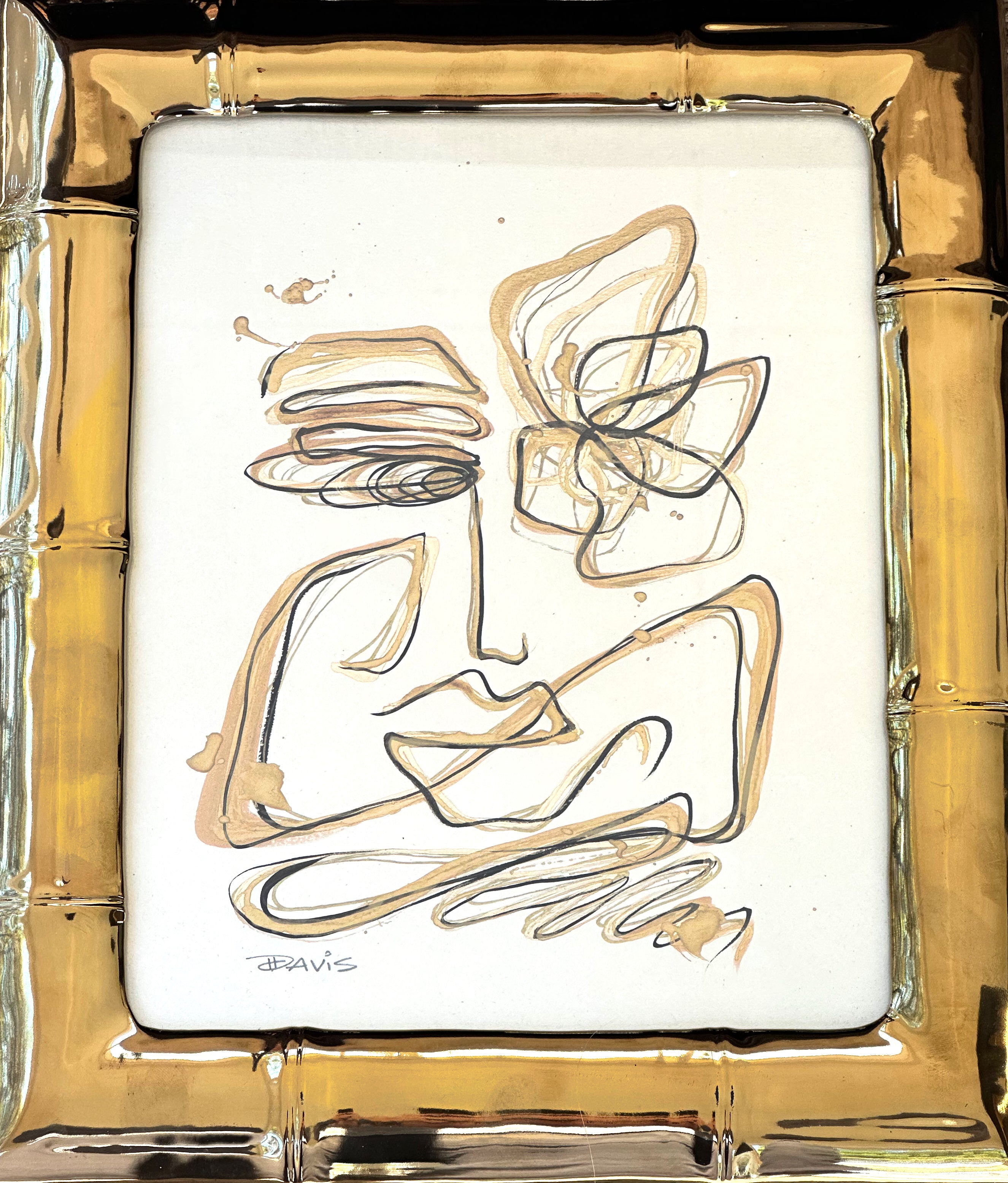 gold and black ink on cream paper in gold frame
