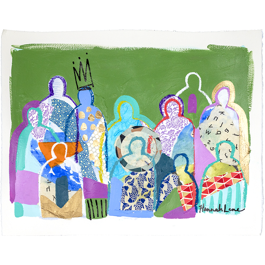Hannah Lane is a contemporary mixed media artist celebrated for her bold use of color and dynamic, collage-like layering. A Louisiana native and graduate of the Savannah College of Art & Design, Hannah draws deep inspiration from the vibrant landscapes, diverse cultures, and heartfelt sense of family and community found in her southern roots. Her work blends pigmented Japanese papers, expressive line work, and rich washes of acrylic paint to create textured, energetic paintings. Each collection reflects her love for nature, storytelling, and community—an invitation to explore the beauty of her inner imagination. Hannah is represented by some of the top galleries in the Southeast, and her paintings are collected privately and in corporate spaces across the country. She also loves working one-on-one with collectors to create meaningful, custom pieces. After living and painting in Italy and New Orleans, Hannah now calls Nashville home, where she is part of a thriving art community. When she’s not painting in her home studio, you’ll find Hannah hiking with her boys, reading, or cooking up something seasonal and delicious! The crowd series is one of my most iconic collections, inspired by my big, beautiful Louisiana family and the joyful spirit of southern gatherings. I grew up surrounded by cousins, friends, and neighbors—many from families as large and lively as my own—where faith and family were at the heart of everything. Over the past 12 years, this series has evolved with new patterns, papers, and symbols that reflect the changing seasons of life. Each crowd painting is a kind of meditation, a reflection on the deep truth that we’re all connected. Rich with personal symbols and intuitive mark-making, these pieces push the boundaries of mixed media and invite you to see something familiar in a new way. Whether you're drawn to the vibrant energy, the quiet details, or the sense of belonging they evoke, each crowd carries its own unique aura—waiting for the right person to bring it home.